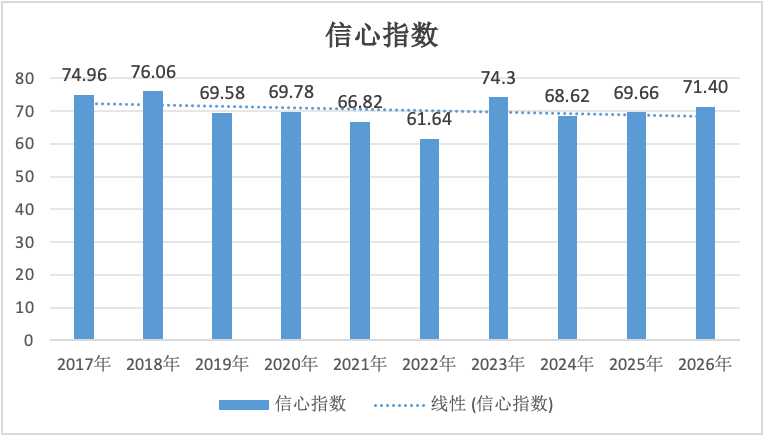 纵观2017年到2026年信心指数(见图14),从2018年(76.06)到达峰值后,随即下降趋势明显,2023年(74.3)信心指数强势反弹后,今年(71.40)的信心指数呈略微上升趋势。