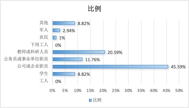 创业者在创业前普遍任职于公司或者企业,占到45.59%,创业前是教师或科研人员的比例为20.59%,公务员或者事业单位职员的比例为11.76%,学生比例占到了8.82%,军人的比例占2.94%,农民占1.47%,其他的比例占了8.82%。