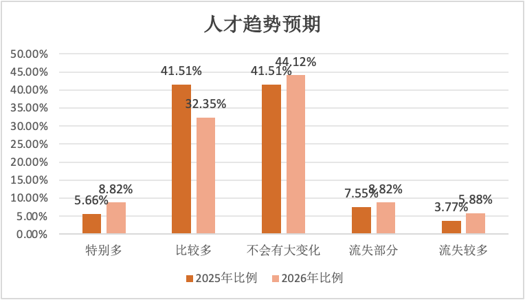 在文旅双创领域人才趋势方面,与2025年相比,今年的数据表现得更为谨慎。预期进入文旅双创领域人才“特别多”和“比较多”的合计占比41.17%,低于2025年的47.17%。而认为“不会有太大变化”的占比高达44.12%,成为主流观点,同时认为“流失部分”和“流失较多”的合计占比为14.7%,与去年有小幅上升。(见图7)