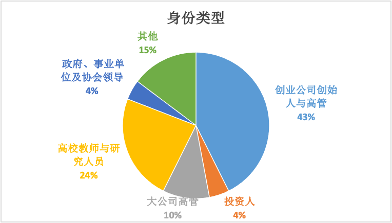 在本次调查中,43%为创业公司创始人与高管;10%为大公司高管;24%为高校教师与研究人员;4%为政府、事业单位及协会领导等。