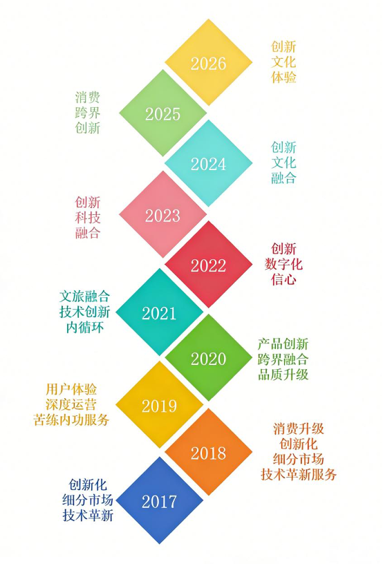 2017年的关键词为“创新化、细分市场、技术革新”,2018年为“消费升级、创新化、细分市场和技术革新服务”,2019年为“用户体验、深度运营、苦练内功和服务”,2020年为“产品创新、跨界融合、品质升级”,2021年为“文旅融合、技术创新和内循环”,2022年为“创新、数字化、信心”,2023年为“创新、科技、融合”,2024年为“创新、文化、融合”,2025年为“消费、跨界、创新”,2026年为“创新、文化、体验”(见图16)。