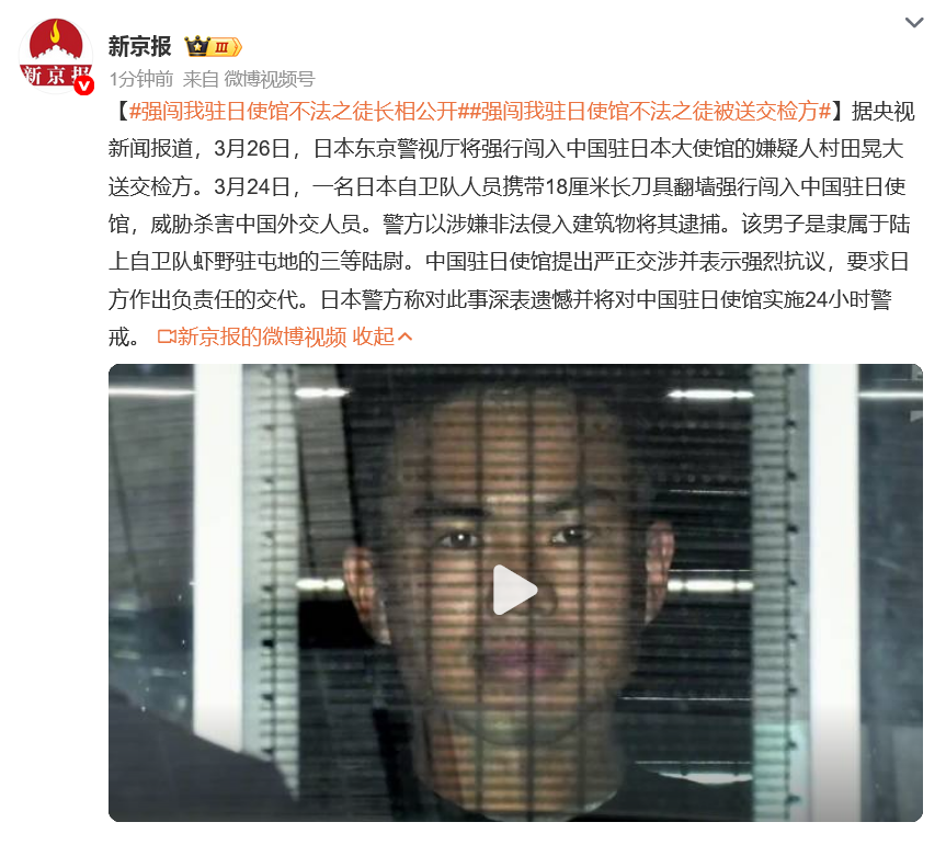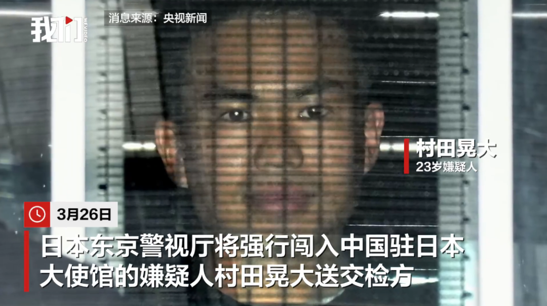 据央视新闻报道,3月26日,日本东京警视厅将强行闯入中国驻日本大使馆的嫌疑人村田晃大送交检方。