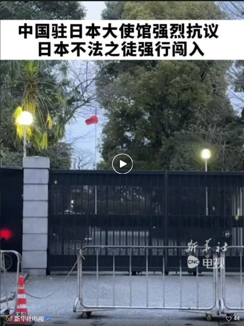 外交部发言人林剑24日在例行记者会上答问时说,3月24日上午,一名自称为日本自卫队现役官员的不法之徒翻墙强行闯入中国驻日本大使馆。此人承认自身行为非法,威胁要以“神的名义”杀死中国外交人员。中方对这一事件深感震惊,已向日方严正交涉、提出强烈抗议。