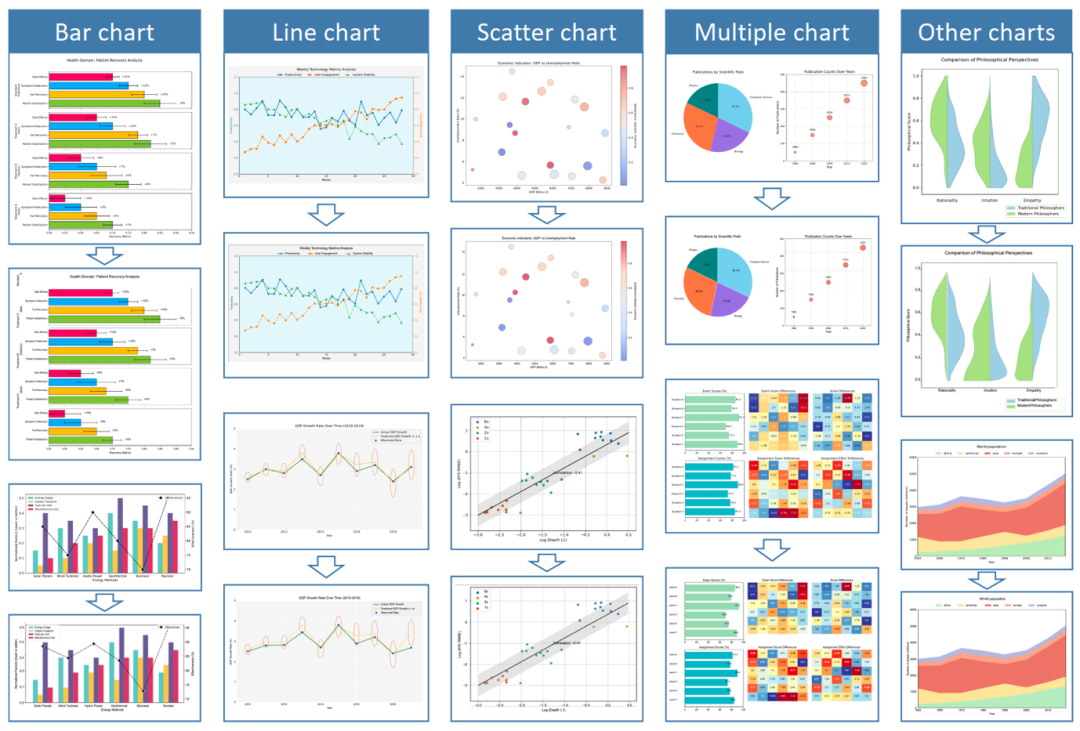 △ dots.mocr-svg对各类统计图表的SVG重建效果,柱状图、折线图、散点图均可忠实还原为可编辑向量图形