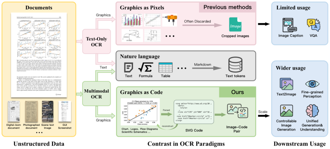 左边是传统路线:文本走OCR管线变成Markdown,图形直接裁成像素图——要么丢弃,要么只能做图像描述(caption)和视觉问答(VQA)这类粗粒度应用。右边是MOCR的路线:图形被解析为SVG代码,和文本一起形成图像-代码配对数据,可以直接用于文生图、细粒度感知、可控图像生成、统一的生成与理解等更广泛的下游任务。