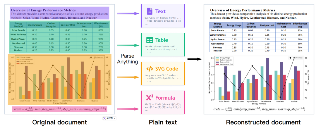 它提出了一个大胆的新范式:不只识别文字,而是「解析一切」——文字、表格、图表、公式、流程图、化学结构式、UI组件……通通变成可编辑、可渲染的结构化代码。用论文的话说,这是把文档图形从「二等公民」升级为「一等解析目标」。