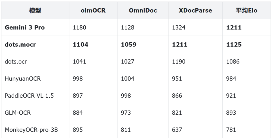 在OCR Arena的Elo评估中,dots.mocr在olmOCR-Bench、OmniDocBench 1.5和XDocParse三个主流基准上均拿到了开源模型第一名,平均Elo达到1125,仅次于闭源的Gemini 3 Pro(1211)。需要强调的是,dots.mocr只有3B参数,而它打败的对手中不乏同等甚至更大规模的专用OCR模型。