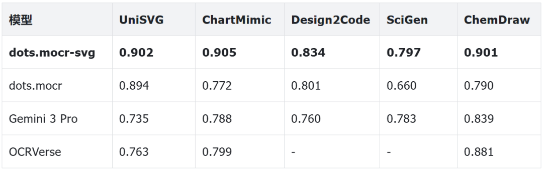 团队最终发布了两个版本:dots.mocr(均衡能力)和dots.mocr-svg(在SFT阶段增大SVG数据比例并加权困难样本的增强版)。