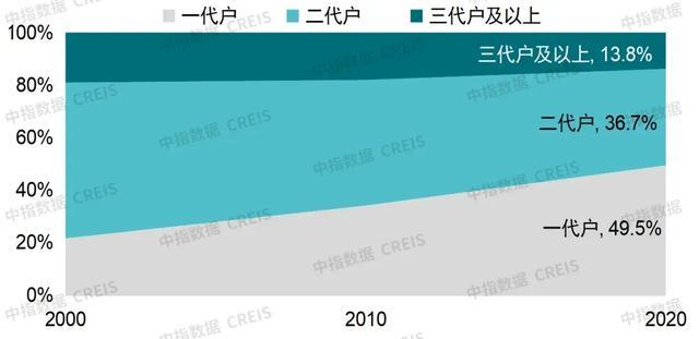 家庭小型化带动家庭户数量增加,独立住房需求释放。七普数据显示,2020年我国家庭户规模为2.62人/户(家庭户共4.94亿),十年间每户减少0.47人,同时2020年一代户家庭占比达49.5%,较2010年提升15.3个百分点,反映出家庭结构日趋小型化的特征。每个新独立家庭通常对应一套独立住房,因此住房总需求将随家庭户增加而增长。