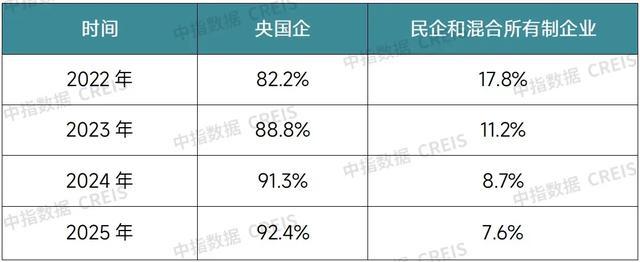 不同性质企业融资分化,民营房企债券融资困境未实质改善。2025年,央国企发行占比超过92%,民企和混合所有制企业发行占比不足8%。央国企“借新还旧”的能力较强,民营房企“融资难”的核心痛点未得到明显改善。