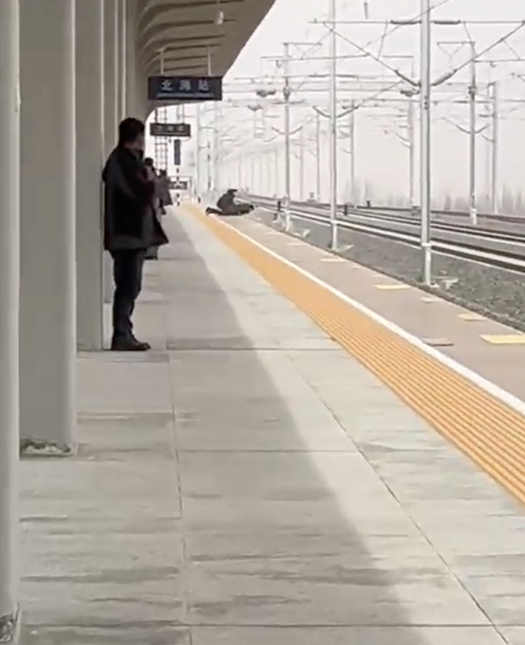 近日,一段短视频平台上发布的视频显示,一处高铁站台上,有两位身穿黑衣的人趴在地面上,身体探出月台边沿,有网友称疑似当天风大,有乘客被吹倒。