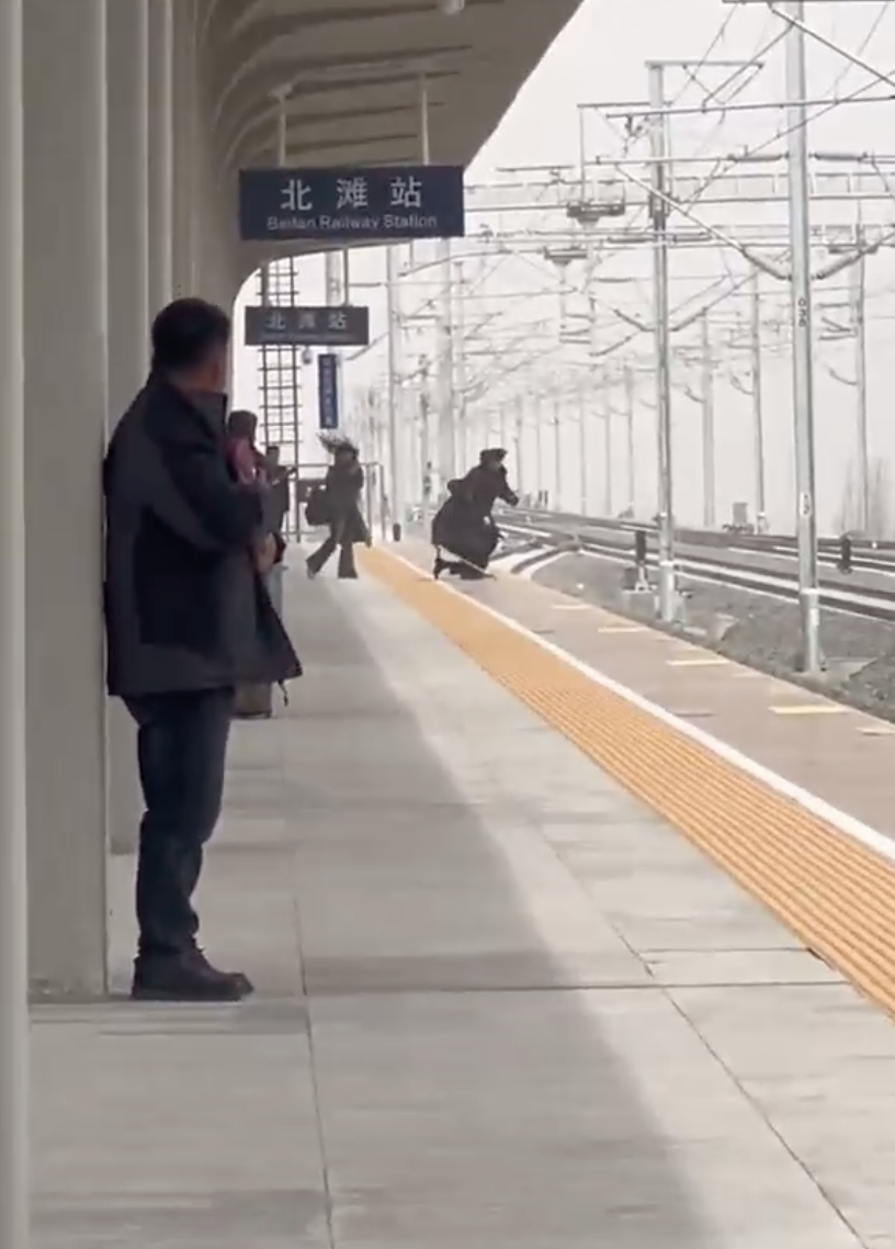 华商报大风新闻记者在视频中看到,站台悬挂有“北滩站”标示牌,该站位于甘肃省白银市靖远县。视频中有很大风声,一位女士头发被风吹得凌乱。地面上趴着的两名黑衣人随后站起身,其中一人手拿长柄拾物夹,疑似有在地面捡拾物品的动作。