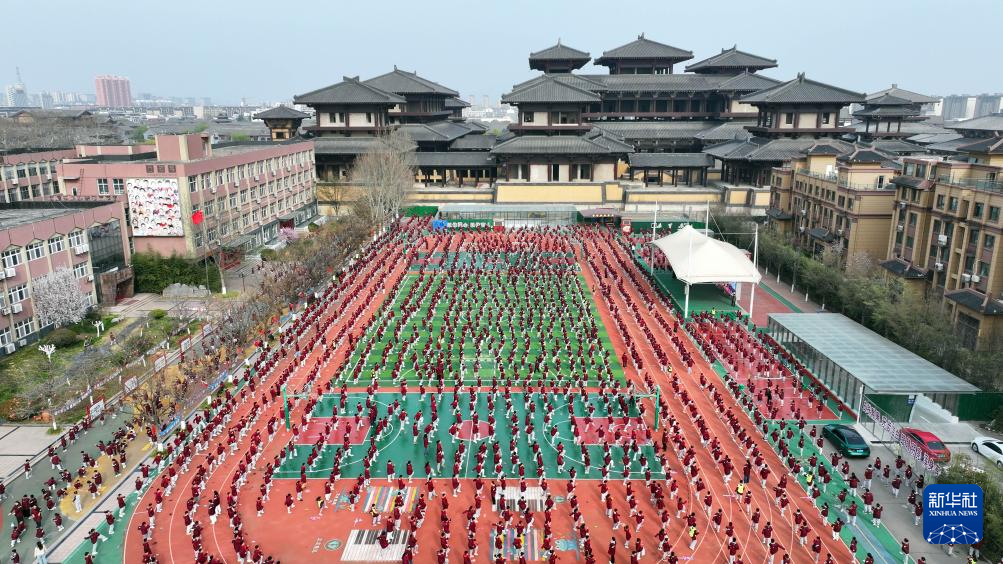 3月26日,在日照市莒县第一实验小学,同学们在进行阳光大课间活动(无人机照片)。