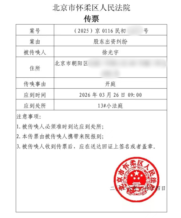徐光宇告诉华商报大风新闻记者,2026年3月26日上午9时左右,北京市怀柔区法院在线上开庭审理此案,一直持续到当天上午11时左右才结束。
