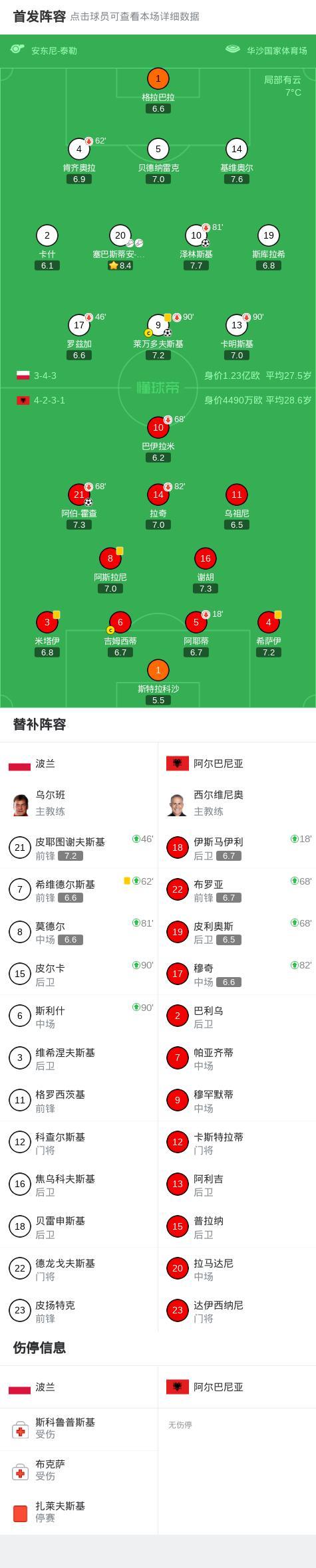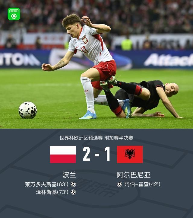 北京时间3月27日世界杯欧洲区预选赛 附加赛半决赛,波兰对阵阿尔巴尼亚。上半场霍查破门建功,下半场波兰莱万多夫斯基头球破门扳平比分,泽林斯基惊天远射反超比分。最终比分波兰 2-1 阿尔巴尼亚。