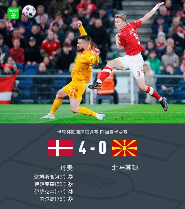 北京时间3月27日世界杯欧洲区预选赛 附加赛半决赛,丹麦对阵北马其顿。下半场达姆斯高首开记录,伊萨克森梅开二度,内尔高后点包抄破门再下一城。最终比分丹麦 4-0 北马其顿。