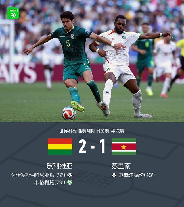 北京时间3月27日世界杯预选赛洲际附加赛 半决赛,玻利维亚对阵苏里南。玻利维亚莫伊塞斯-帕尼亚瓜破门,米格利托破门。苏里南范赫尔德伦破门。最终比分玻利维亚 2-1 苏里南。