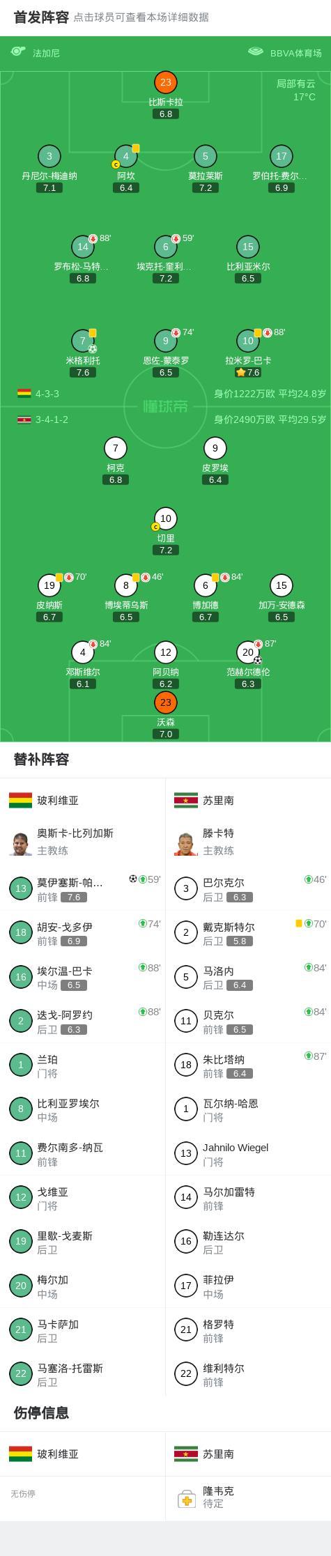 第72分钟,莫伊塞斯-帕尼亚瓜捅射破门扳平比分,玻利维亚1-1苏里南
