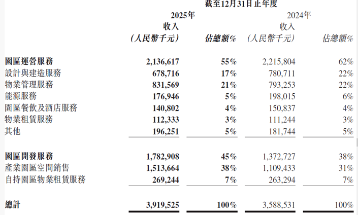 2025年,中电光谷的园区运营服务营业额21.366亿元,较2024年同期下降3.6%。其中设计建造服务收入6.787亿元,物业管理服务收入8.316亿元,区域能源服务收入1.769亿元,园区餐饮及酒店服务收入1.408亿元,物业租赁服务收入1.123亿元及其他服务收入1.963亿元。