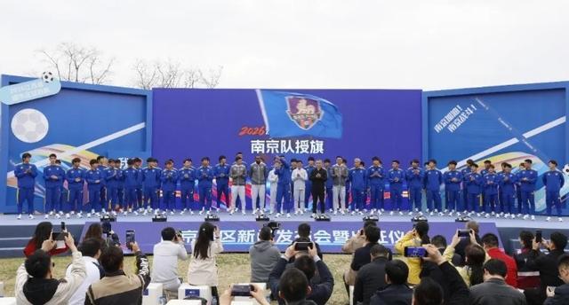 北京时间3月26日,2026“苏超”南京赛区新闻发布会暨出征仪式在金陵STYLE浪漫中心举行。发布会上,南京队球员及教练员集体亮相。2026年“苏超”南京队共有教练员4名、工作人员7名、球员50名。球员来源广泛,从去年年底开始组队,经过两轮筛选和冬训选拔确定,主要包括南京青训、校园足球、驻宁高校、职业俱乐部、宁超联赛等优秀球员,还有部分社会球员加入了南京队。