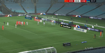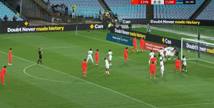 第27分钟,库拉索门将手接回传球违例;紧接着国足间接任意球配合打门被挡