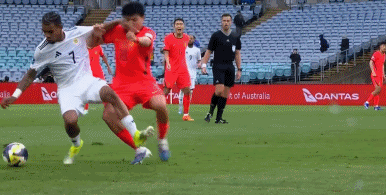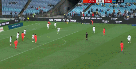 第45+2分钟,张玉宁头球摆渡,韦世豪左脚抽射破门,国足1-0领先库拉索!