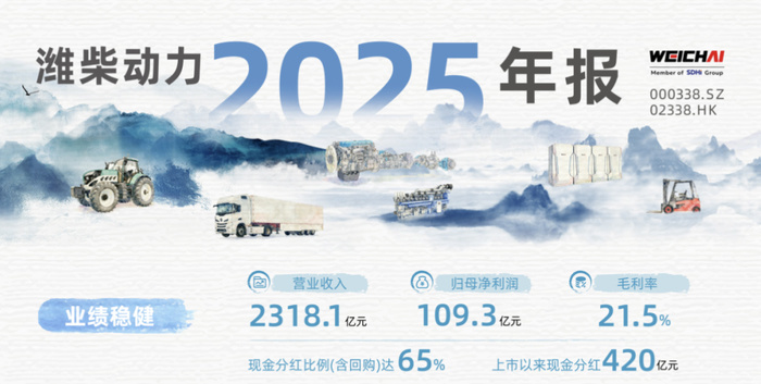 3月26日,山东高端装备制造龙头潍柴动力(000338.SZ)正式发布2025年年度报告。记者梳理年报数据获悉,报告期内公司实现营业收入2318.1亿元,同比增长7.5%;归母净利润109.3亿元,整体经营保持稳健运行态势。同时潍柴动力同步推出高比例股东回报方案,拟向全体股东每10股派发现金红利3.74元(含税),全年现金分红比例(含股份回购)达到65%,以真金白银持续回馈广大投资者。