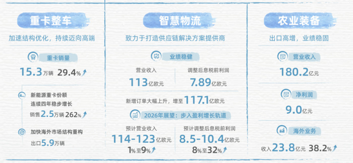 商用车业务板块则展现出强劲的增长韧性,公司全年重卡整车销量达15.3万辆,行业市占率稳居第一梯队。其中新能源重卡赛道迎来爆发式突破,全年销量达2.5万辆,同比大幅增长262%;海外市场布局持续深化,全年重卡出口规模达5.9万辆,全球化市场版图进一步拓宽。