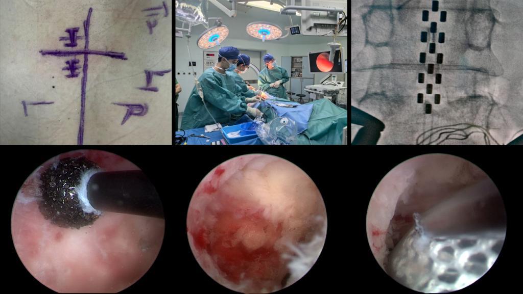 经医院多学科团队(MDT)严谨评估,并征得患者及家属知情同意后,团队决定采用UBE内镜辅助下的SCS植入术。与传统SCS手术相比,UBE技术的引入实现了手术区域的高清可视化与微创化。在不足一厘米的骨窗下,内镜能够提供清晰、放大的术野,精准识别硬膜外结构,从而更安全、更精准地将刺激电极置入目标节段,有效降低了传统手术可能带来的骨性破坏、硬膜损伤及电极移位风险。