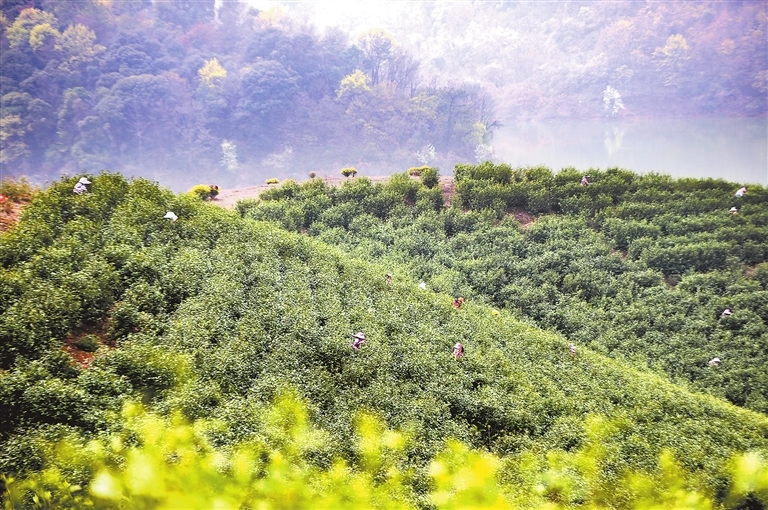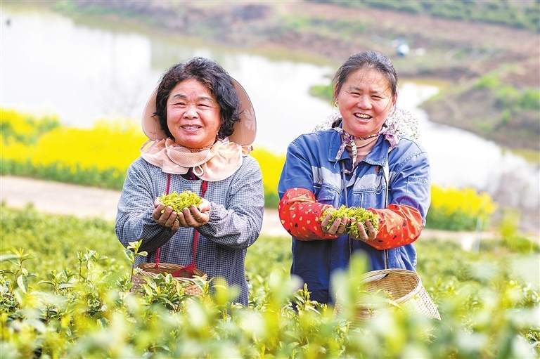 3月25日,湖口县舜德乡高桥村生态茶园,村民正在采摘春茶。(郑飞华 九江日报全媒记者 孙昌模 摄)