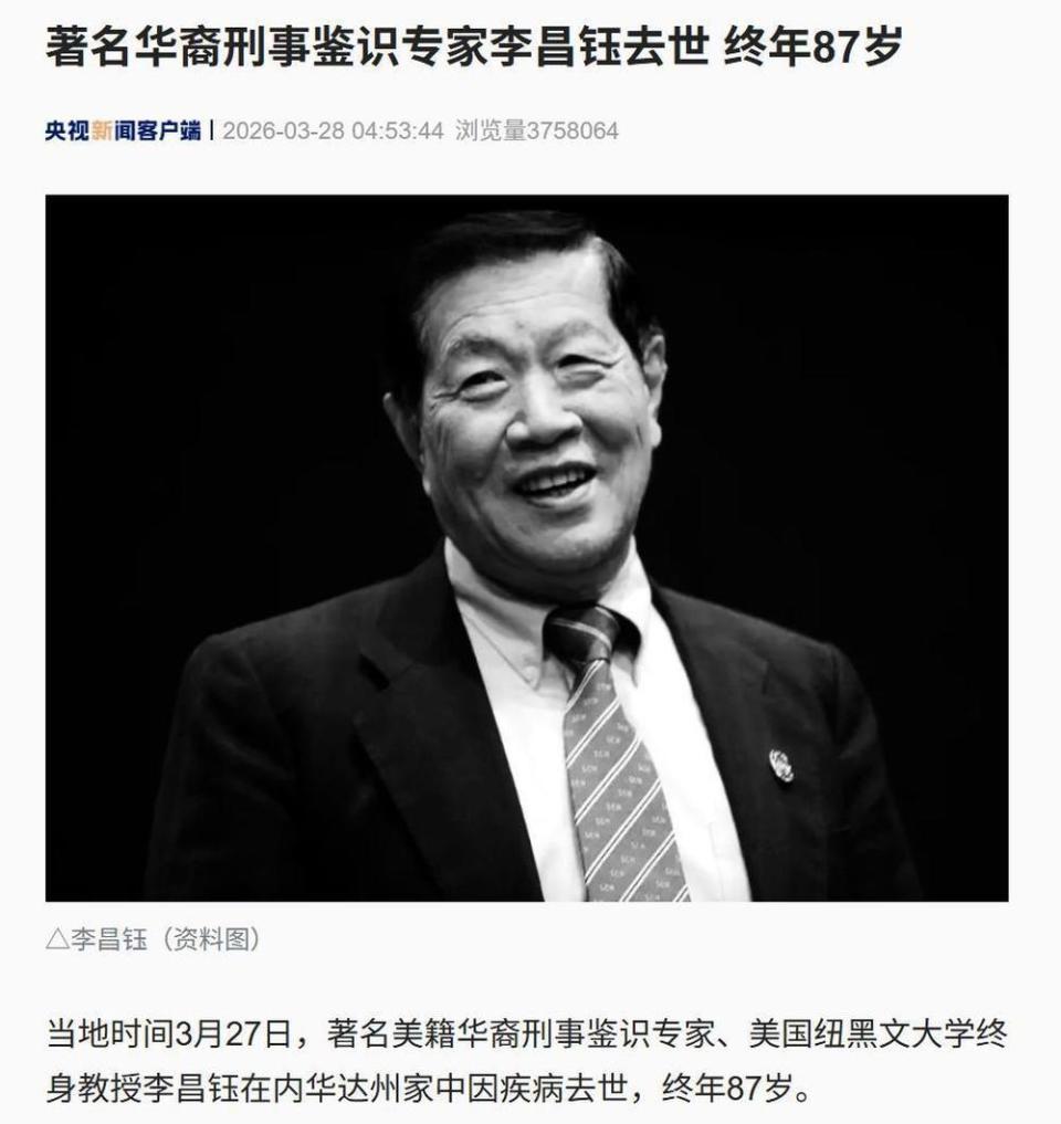 据央视新闻报道,当地时间3月27日,著名美籍华裔刑事鉴识专家、美国纽黑文大学终身教授李昌钰在内华达州家中因疾病去世,终年87岁。李昌钰曾参与数百起案件审理,并参与调查多起重大刑事案件。
