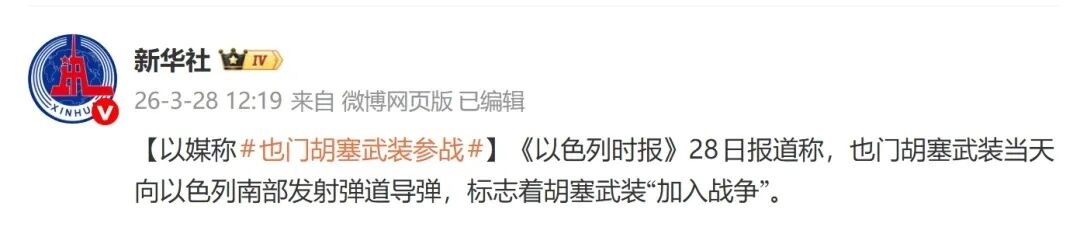 3月28日,@新华社:《以色列时报》28日报道称,也门胡塞武装当天向以色列南部发射弹道导弹,标志着胡塞武装“加入战争”。