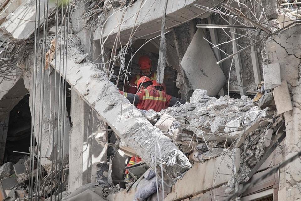 △当地时间3月27日,消防员在伊朗德黑兰一栋被毁居民楼的废墟中工作