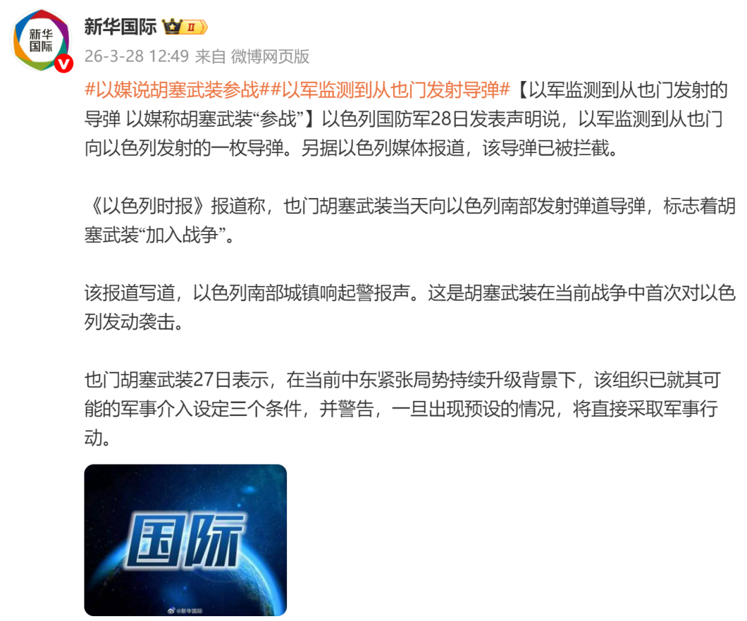 据央视新闻:也门胡塞武装当地时间3月28日发表声明称,为回应当前地区局势升级,以及针对黎巴嫩、伊朗、伊拉克和巴勒斯坦相关目标的军事行动,该组织已开展首次军事行动。