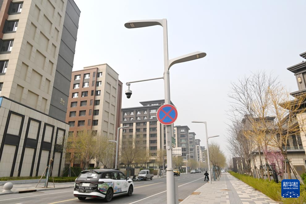 雄安新区容东片区内的智慧灯杆(3月26日摄)。智慧灯杆搭载着各类传感器,实时捕捉交通流量,再通过算法自动调整红绿灯配时,打造“智能弹性绿波带”。