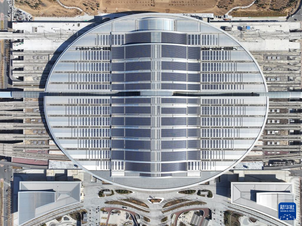 这是京雄城际铁路雄安站(3月18日摄,无人机照片)。京雄城际铁路雄安站站顶分布式光伏电站总装机容量6000千瓦,站顶铺设1.77万块、4.2万平方米多晶硅光伏组件,电站采用自发自用、余电上网模式,自2020年12月正式并网发电以来,已累计发电超过3100万千瓦时。