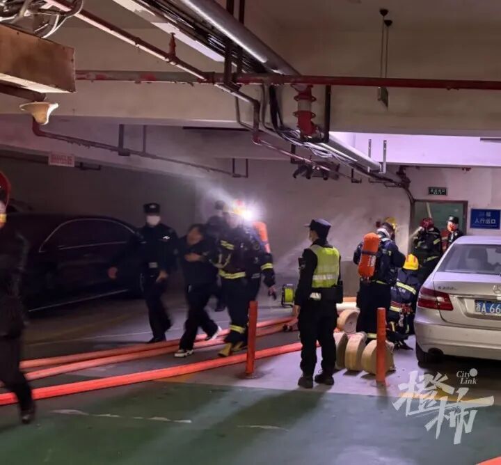 锦昌文华28幢地下出入口有人被消防员搀扶出来