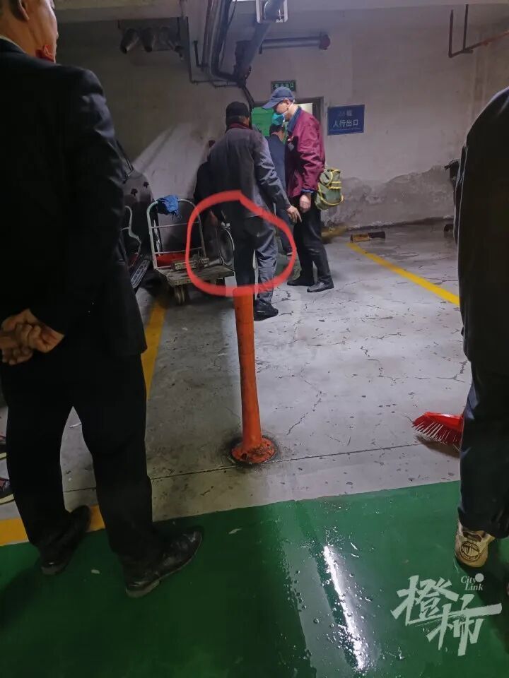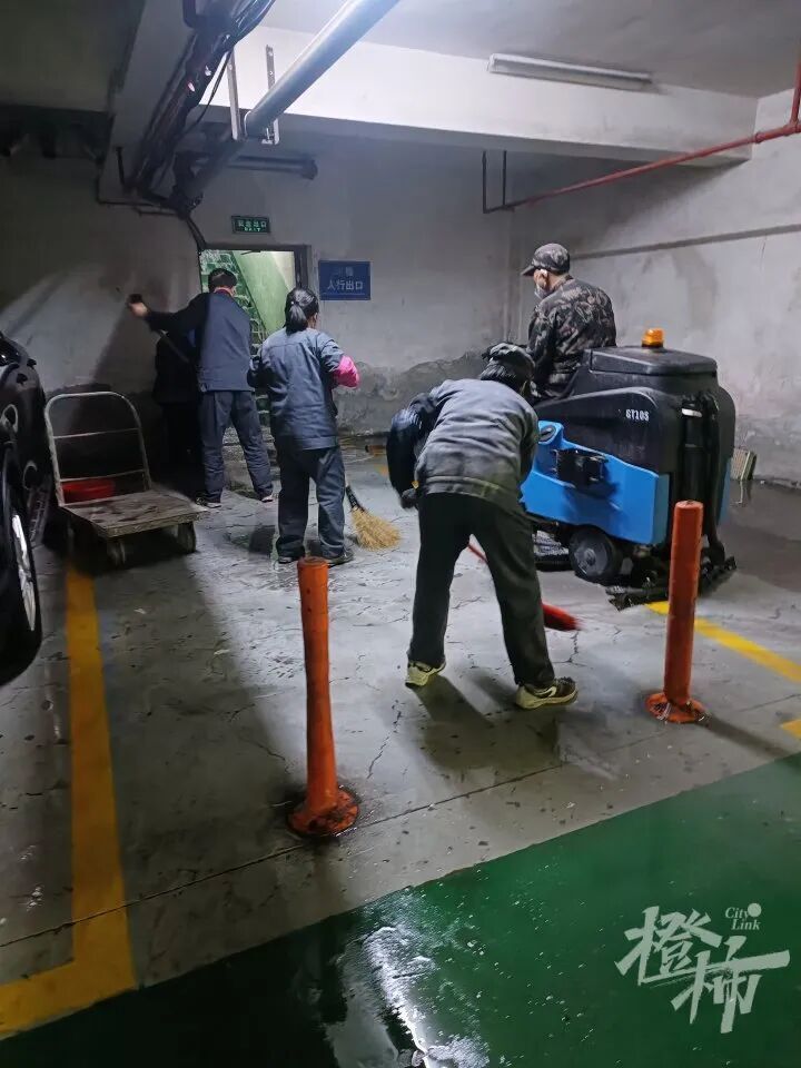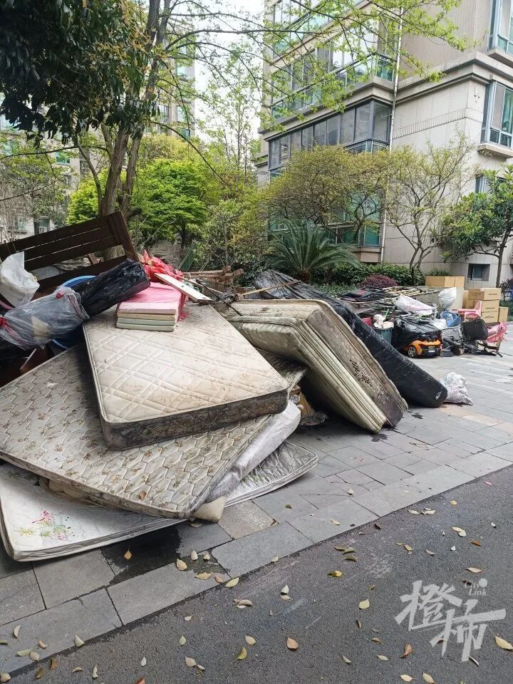 上午11点,记者见到在28幢的地下车库层人行出口处,大量的物业工作人员在清运杂物,11:40,一台白色的空调外机被运了出来。在小区的北面地面,记者见到了从地下架空层运出的杂物,堆成2堆,最显眼的是数张硕大的床垫。