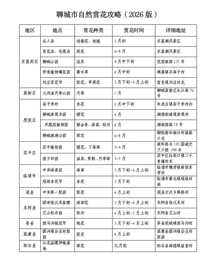 该攻略既覆盖了东昌湖风景区、凤凰苑植物园等城市公园,也包含了中华第一梨园、艾山牡丹园等乡村景点,可满足市民游客近郊休闲与远足踏青的多元需求。