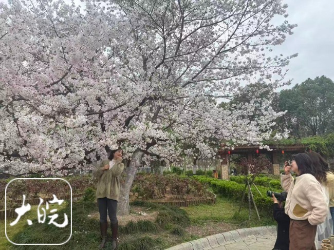 蜀山西扩公园内造型别致的樱花树吸引游客拍照打卡。