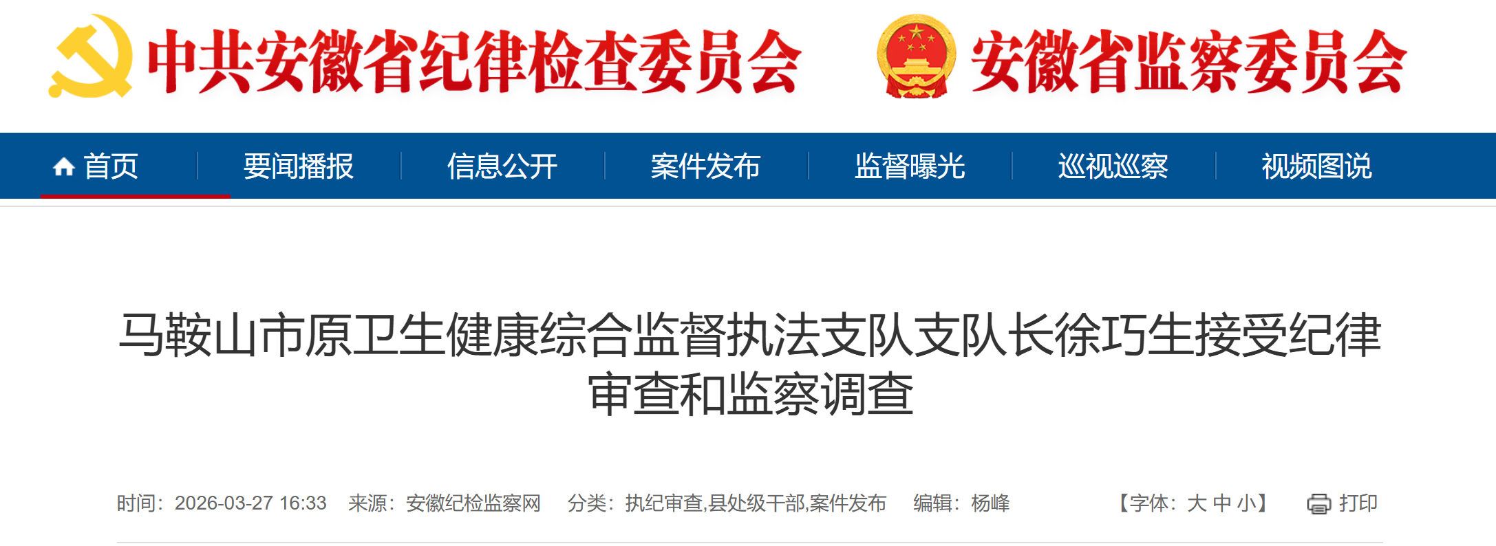 据安徽纪检监察网3月27日消息,马鞍山市原卫生健康综合监督执法支队支队长徐巧生涉嫌严重违纪违法,目前正接受马鞍山市纪委监委纪律审查和监察调查。(马鞍山市纪委监委)