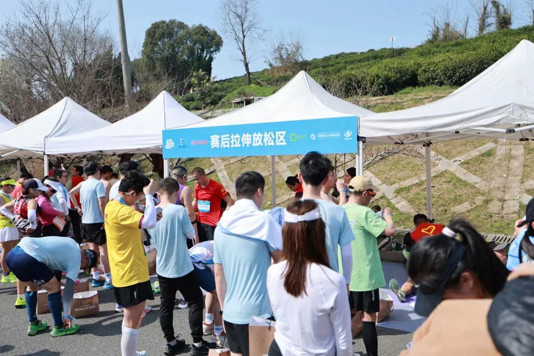 而在赛后恢复区,50块瑜伽垫整齐铺开,不少跑完的选手纷纷过来拉伸放松,舒缓着运动后的疲惫。
