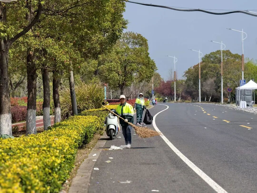 等最后一名选手冲线、赛道解封,保洁组先人工清扫一遍,随后2台洗扫车、1台高压冲洗车、2台垃圾压缩车、6台小型转运车同步进场,人机配合、分段推进,效率拉满。
