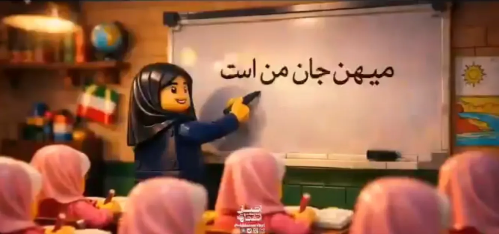 镜头一转,教室里,一个戴着头巾的伊朗女教师正在教课,黑板上用写着“我的故乡是我的灵魂”。下一幕,一个书包躺在废墟之中。一名伊朗士兵抱起书包,眼含愤怒的泪水,向美国发射了导弹。