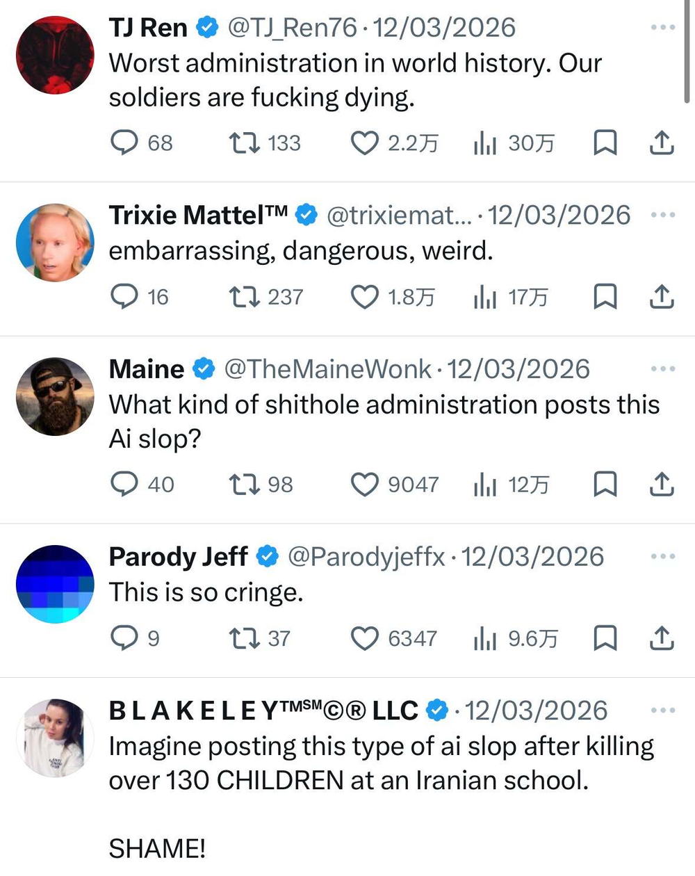 因此,白宫戏谑式的调侃让所有网民都感到愤怒。评论区几乎全是谩骂的声音。政府的嬉闹和人们的怒火,勾勒出一个比动画还要魔幻的世界。