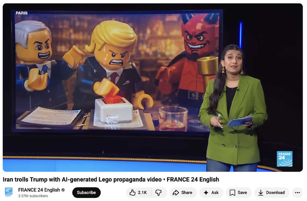 这也是传播政治目的最好方式。AI捏出来的虚拟内容本来就会让人放下心中的警惕,而像乐高和动物这种非人化的形象,会进一步降低观众的负罪感。