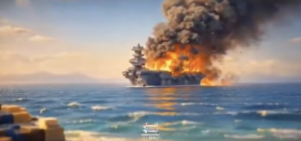 视频的后半段充斥着轰炸。伊朗无人机袭击了迪拜的帆船酒店,导弹发射车列队驶过高速公路,美国驻利雅得大使馆被空袭,一艘美国航母在地平线上燃烧。