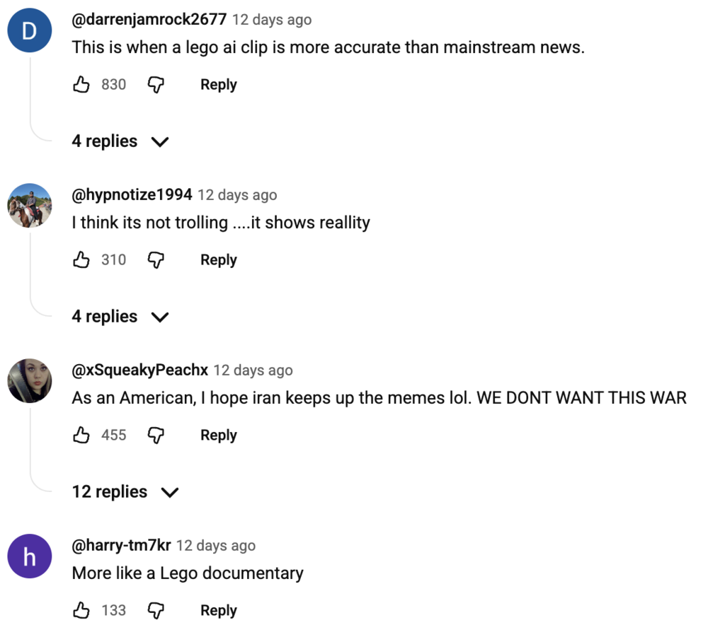 在这些仿乐高视频的评论区里常常能看到一类很有意思的留言。很多人不只把它们当个乐子看,反而觉得这些仿乐高动画,比主流媒体端出来的信息还要真实点。