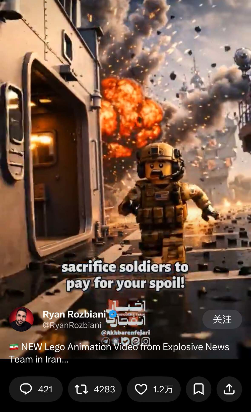 看多了就会发现,这些视频都秉承着一个非常清晰的主线:特朗普哈哈笑——特朗普指挥军队攻击伊朗——轰炸——轰炸——轰炸——伊朗反击——伊朗胜利——特朗普嗷嗷哭。