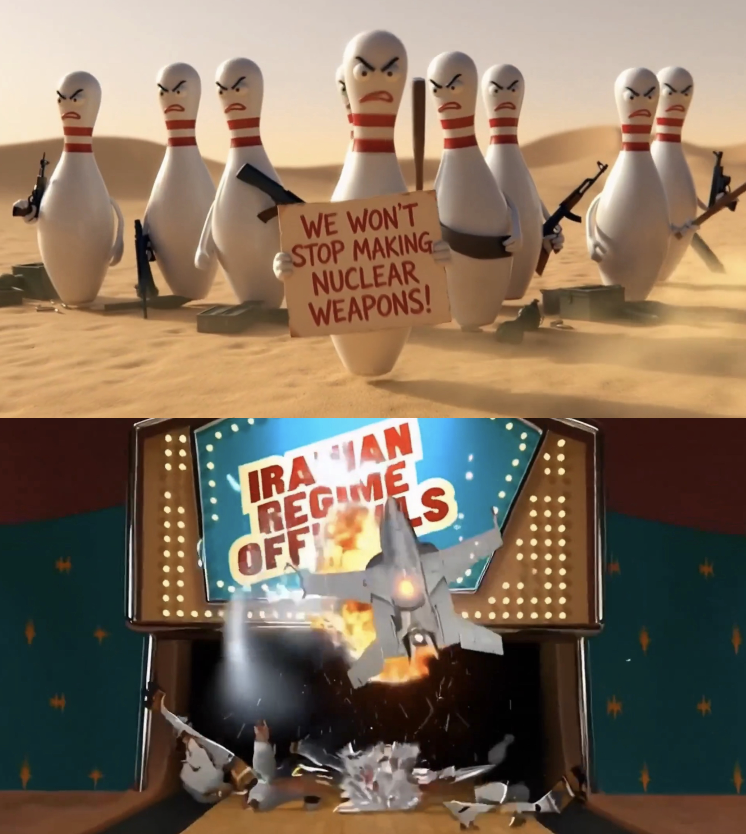 文案里写着的Strike,既可以指保龄球里的一球全中,也有军事打击的意思。他们把保龄球瓶做成了伊朗的战士,手举“我们不会停止制作核武器”的牌子,结果被瞄准轰炸。